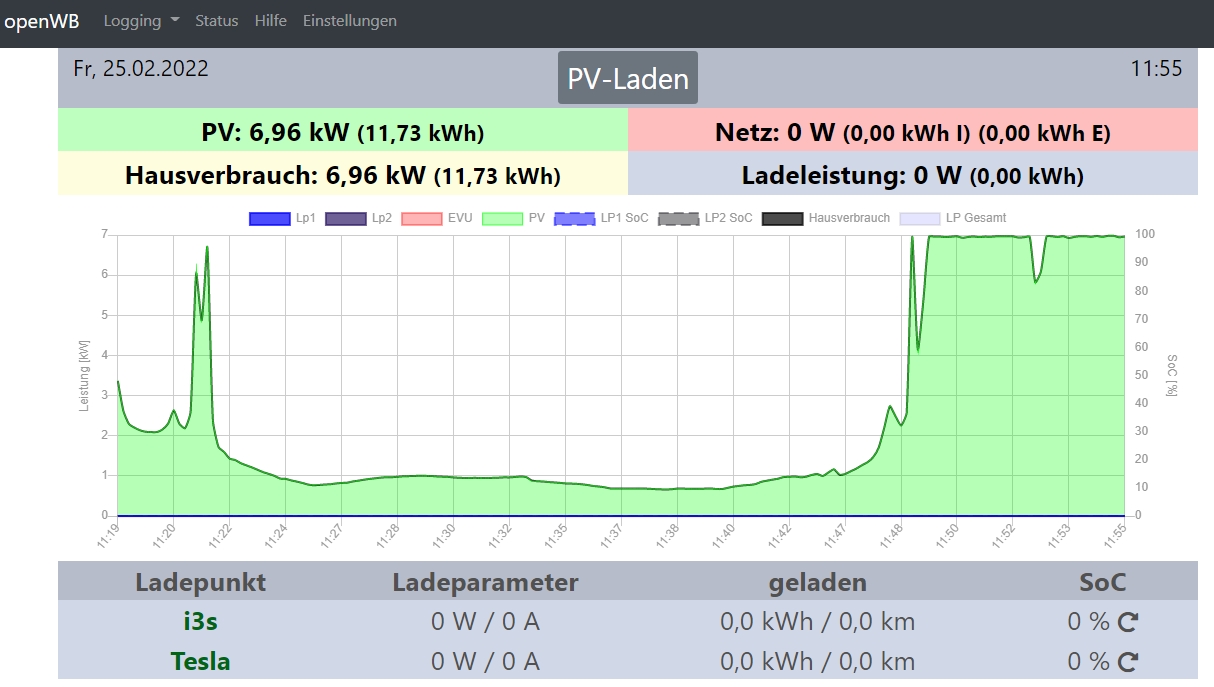 Die openwb läuft seit etwa 1,5 Jahren und geladen hab ich gestern auch noch ganz normal am Vormittag. Heute noch nicht, obwohl der i3 angesteckt und die openwb auf PV-Laden gestellt war. Der SOC vom Auto liegt bei 73%. Die openwb macht aber keine Anstalten zu laden.