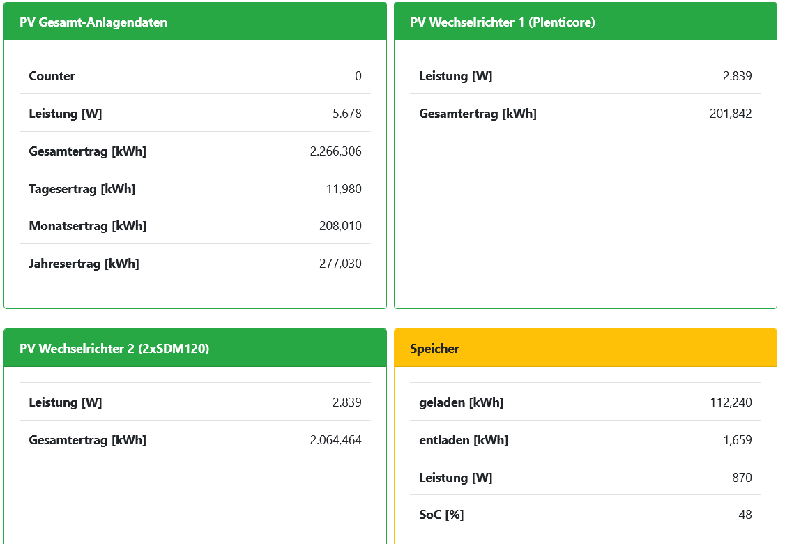 Die reale ausgelesene Leistung aus den 2x SDM120 in meinem PV2- Modul wird nicht mehr verarbeitet. Es wird dort 1:1 der Leistungswert vom PV1- Modul direkt verwendet (ändert sich natürlich analog zu PV1). Die Zählerstände (Gesamtertrag) passen hingegen weiterhin.