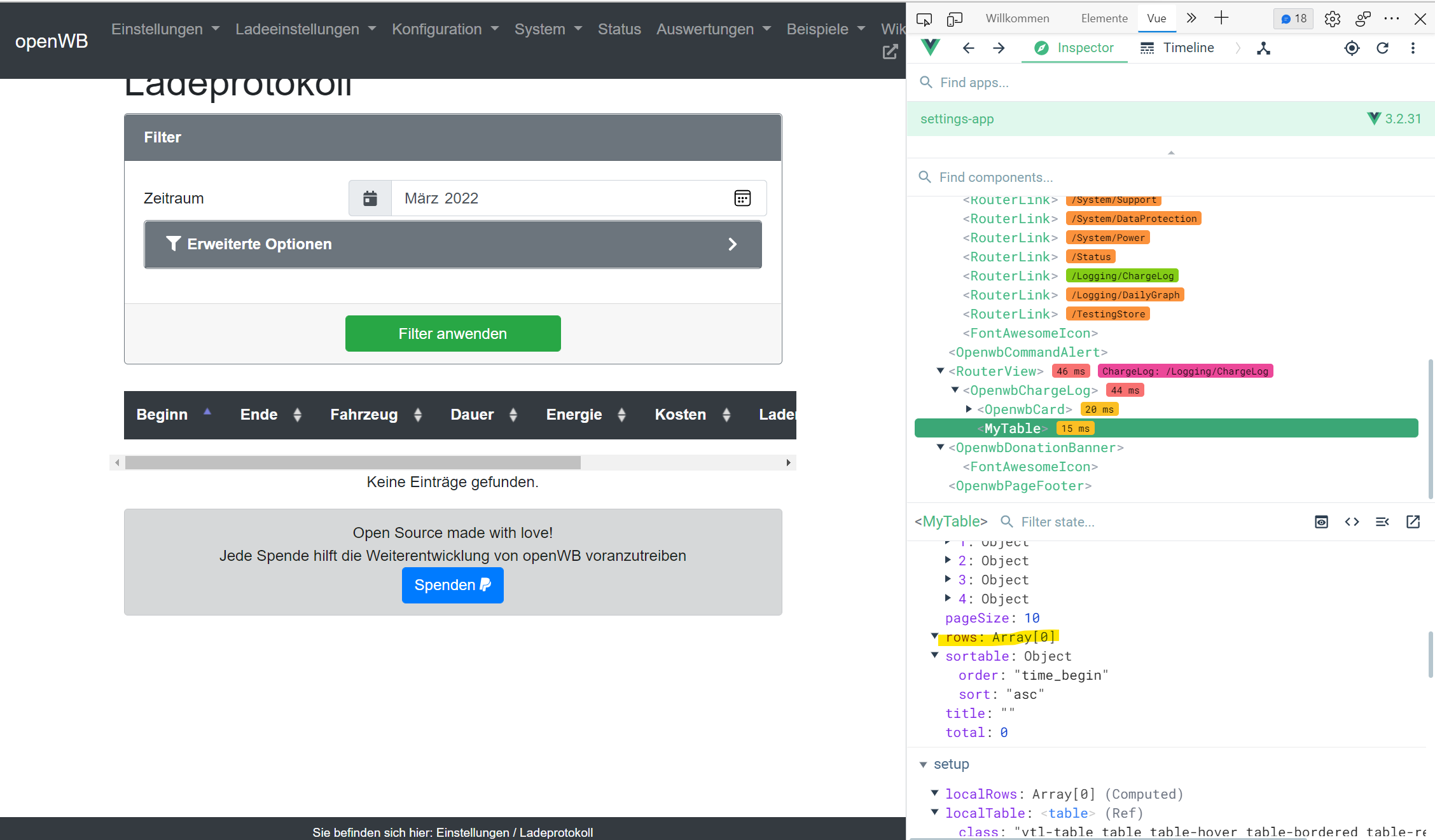 Vue Tools habe ich sogar installiert, weiß aber nicht so recht wohin ich schauen soll, spontan ist mir ein leeres Array aufgefallen, sollten hier die Daten sein?