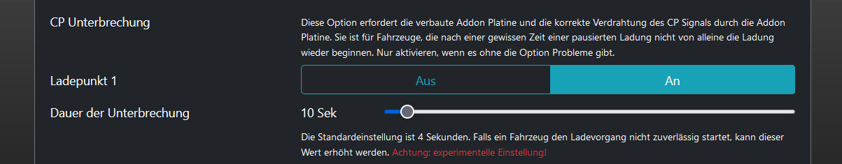 Auch als die CP Unterbrechung noch auf off war? Bzw. warum hast du die Einstellung/CP-Unterbrechung überhaupt aktiviert - gabs einen bestimmten Grund?Nasdero hat geschrieben: Di Mai 03, 2022 5:27 pm Unsere startet immer automatisch, CP Unterbrechung einfach einmal einschalten und testen wenn verbaut würde ich sagen.