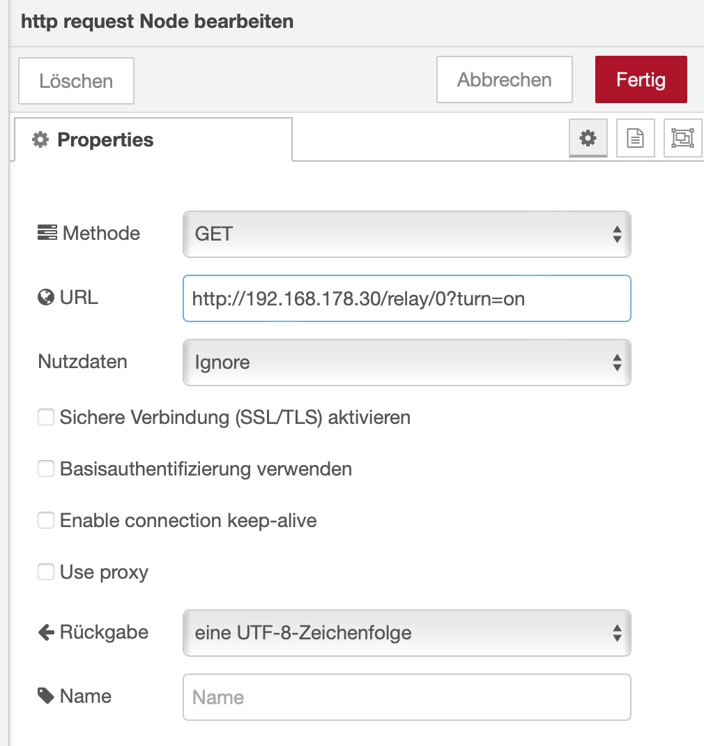 Zu guter Letzt kommen nun noch die den Shelly schaltenden http-Befehle in eigene Nodes: