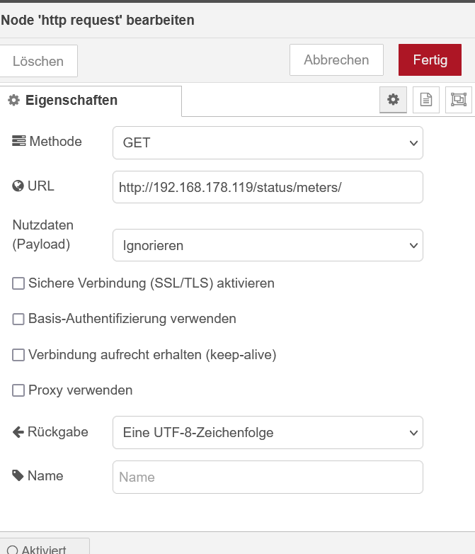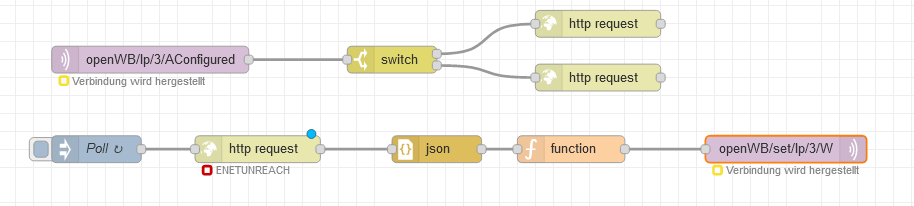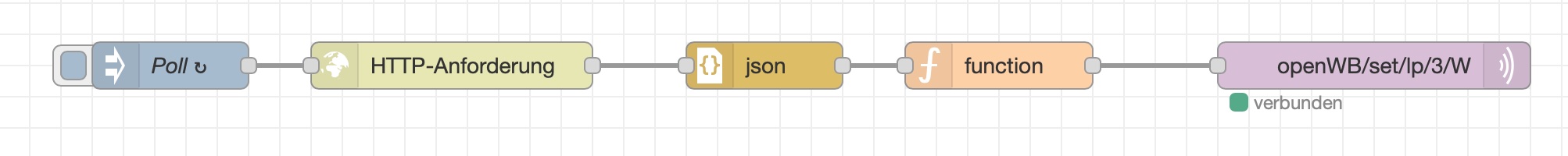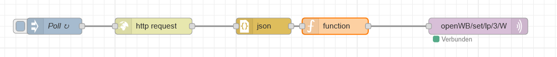 Gero hat geschrieben: Mo Mai 09, 2022 10:47 am Nun fehlt nur noch die aufgenommene Leistung. Hier fangen wir mit einer Inject-Node an, die alle 5 Sekunden eine Message in die http-Node schickt. Die wird dadurch angeregt, den Shelly nach den Zählerdaten zu fragen. Die Antwort konvertiert die JSON-Node in Javascript-Objekte, aus denen dann in der nachfolgenden function-Node die aktuell aufgenommenen Watts herausgelesen werden. Das schickt die MQTT-Node dann zurück an die openWB.