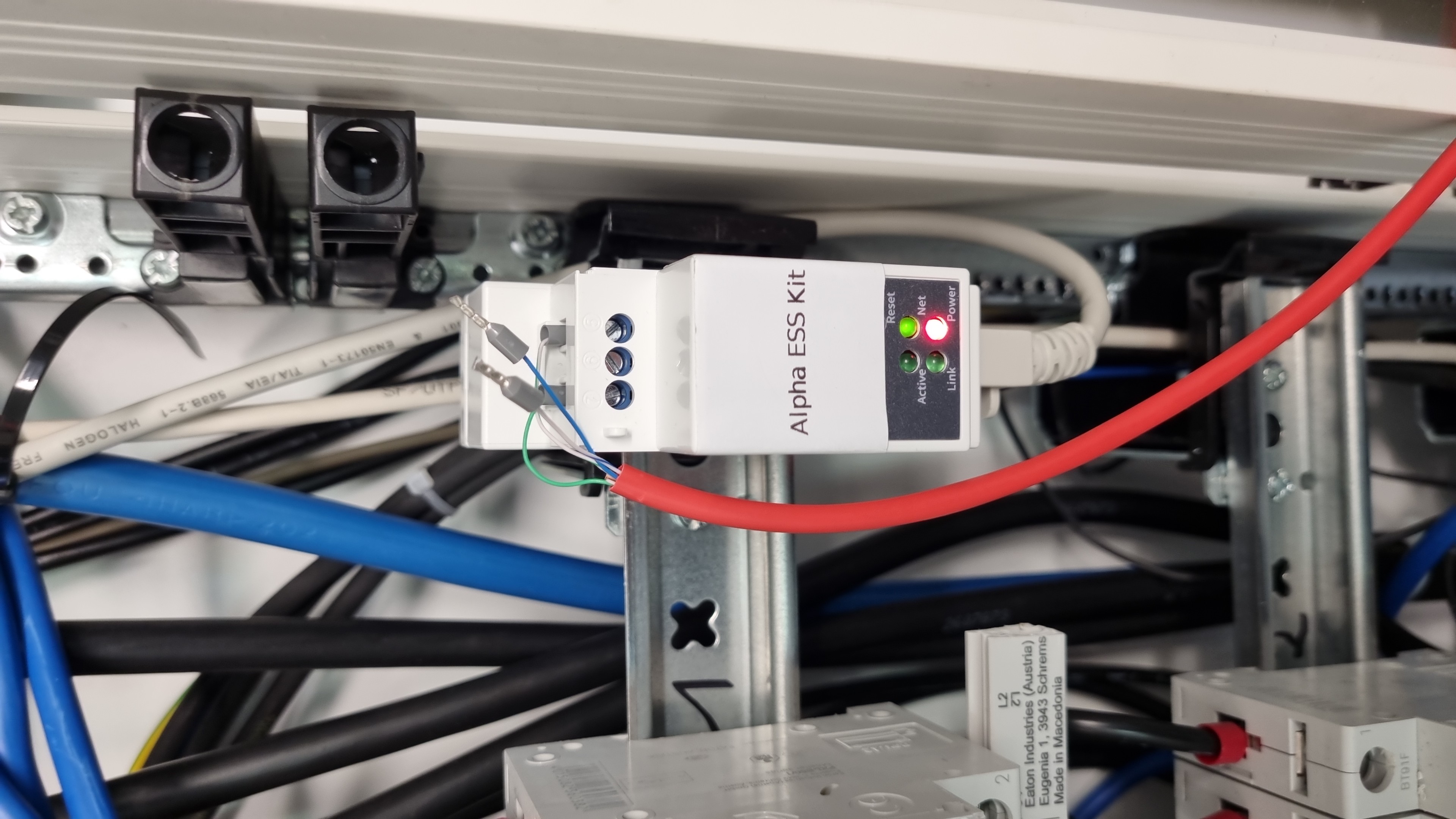 Das Kabel zum openWB-Alpha-Kit (Modbus-Ethernet-Interface) haben wir am Alpha bei INV eingesteckt. Leider kommt keine Verbindung mit dem Interface zustande. Das Alpha-Kit hat Spannung und Netzwerk, die anderen beiden LED leuchten nicht. Der GND-Kontakt (zwischen A und B) ist nicht belegt.