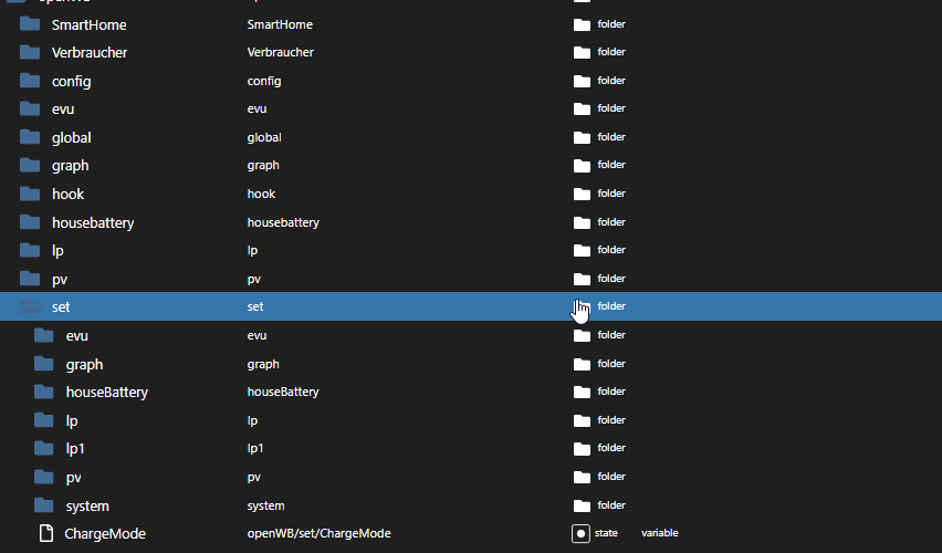 Ich arbeite mit ioBroker und bekomme da schon eine ganze Reihe an Datenpunkten von der openWB. In die openWB setzen tue ich aktuell nur den Fahrzeug SoC. Wie gesagt, so eine MQTT Topic Liste wäre toll, denn das was ich aktuell an DP`s bekomme, scheint mir nicht geeignet zu sein die Lademodi zu ändern.