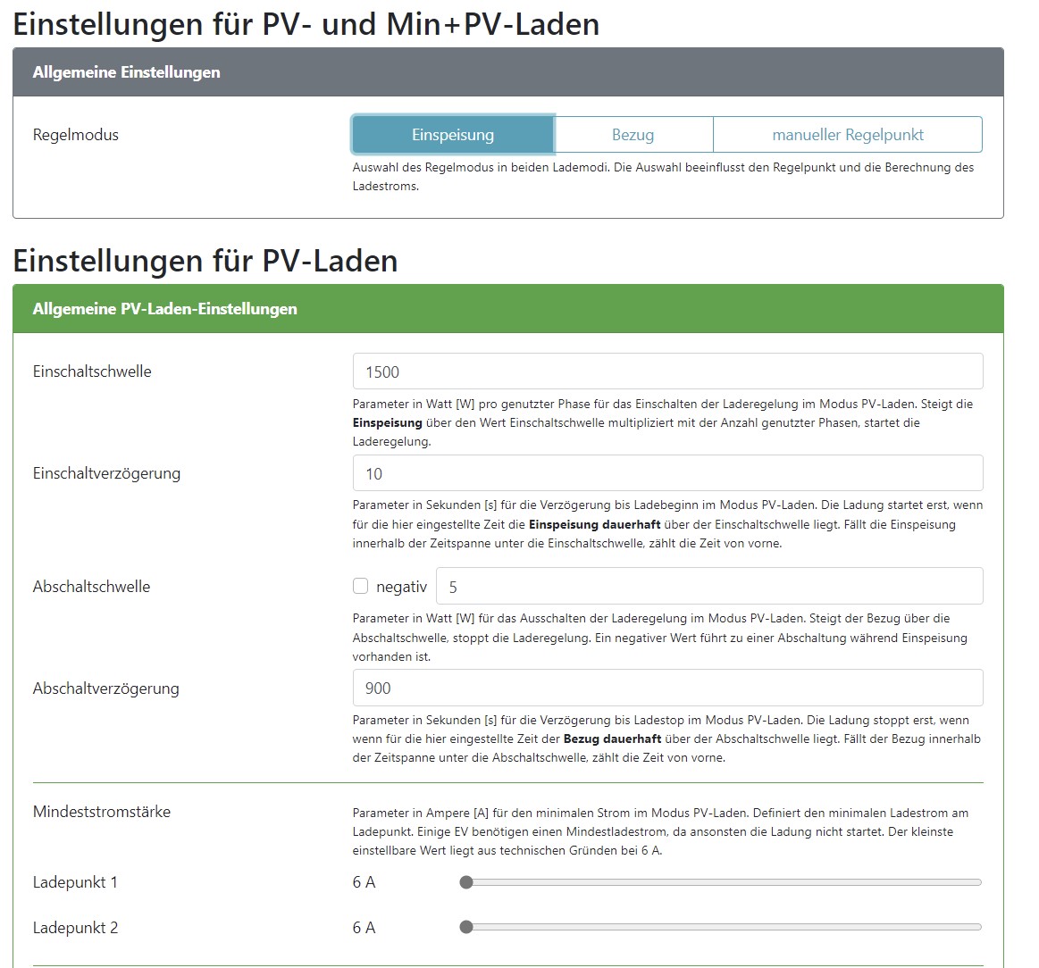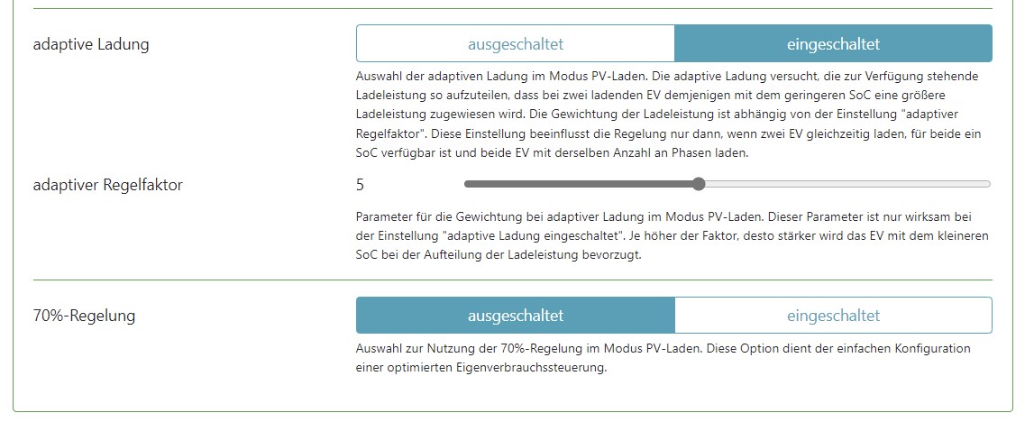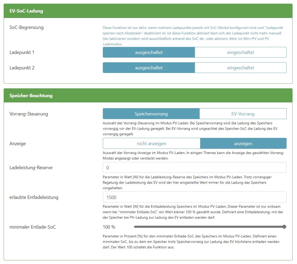OK, im Sofortmodus kann ich es nachvollziehen. Wenn ich jetzt aber den Abschnitt zu Min+PV und SoC lese, hätte ich vermutet, dass ich einstellen kann, bis wann er die Batterie entläd bzw. wie voll die Batterie immer sein muss. Ab diesen Punkt hört er mit dem Laden des PKWs dann aber komplett auf und bisher hat es sich so gelesen, dass er dann zwar weiter läd, aber die Batterie eben nicht unter x% fällt.