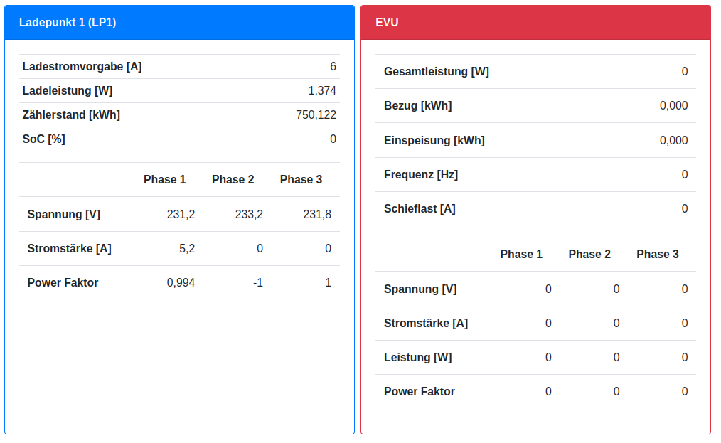 Du bekommst keine Daten vom SMA HomeManager, die EVU Karte ist komplett auf Null. Hast Du ein HomeManager 2.0? Falls ja, ruf' den mal im Browser auf und trag' die IP der openWB für die 'direkte Kommunikation' mit ein, alternativ könnte das auch im SunnyPortal gehen. Das wäre die einfachste Option warum Du keine Daten vom SHM erhälst.