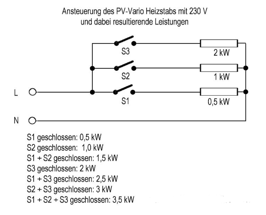 Ich habe inzwischen einen 230V Heizstab gefunden, der sich durch 3 Schalter in 500Watt Schritten bis 3,5kW sicher schalten lässt. Das wäre mit 3 Shelly ohne Schütze möglich, da diese jeweils max. 2000 Watt schalten müssten. Der Stab kostet 300€ und besitzt einen mechanischen Temperaturregler mit Abschaltung.