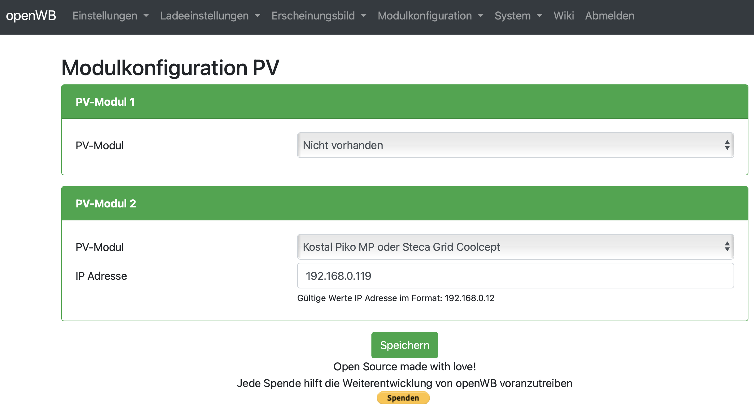 ich habe eine brandneue openWB mit SW Version: 1.9.262. Außerdem einen Kostal Piko 3.6 MP. Das ist ein alter einphasiger Wechselrichter, der baugleich mit StecaGrid 3600 zu sein scheint. Ich kann den WR meines Wissens ausschließlich über html abfragen, Adresse ist bei mir: http://inv006202240015/page.measurements.html. Unter der Adresse gibt der Webserver des WR u. a. eine Tabelle mit den aktuellen Messwerten aus. Ich habe schon alle in Frage kommenden Module der openWB durchprobiert: Kostal Piko, Kostal Piko alt, Kostal Plenticore, Kostal Piko MP und Steca Grid Coolcept. Mit keinem bekomme ich die Werte in die openWB.