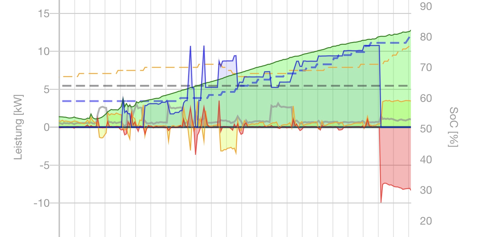 - Beim PV-Laden habe ich keine konstanten Ladeparameter, sondern diese Schwanken stark nach oben bzw unten, obwohl di ePV-Leistung und der Hausverbrauch eigentlich konstant sind. Sobald allerdings geladen wird schwank der Hausverbrauch massiv, obwohl keine zusätzlichen Verbraucher aktiv sind. Ist glaube ich auch gut am Bild erkennbar