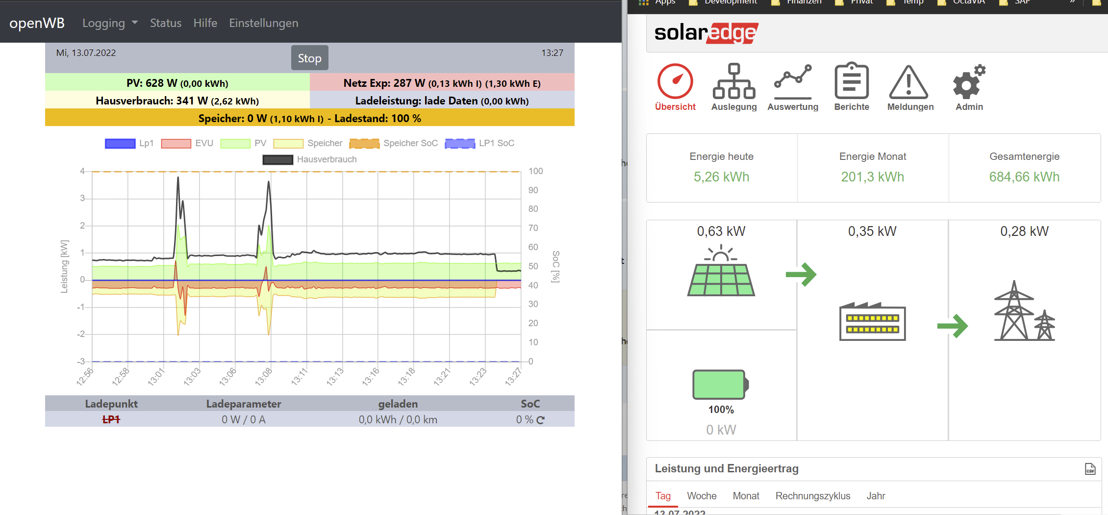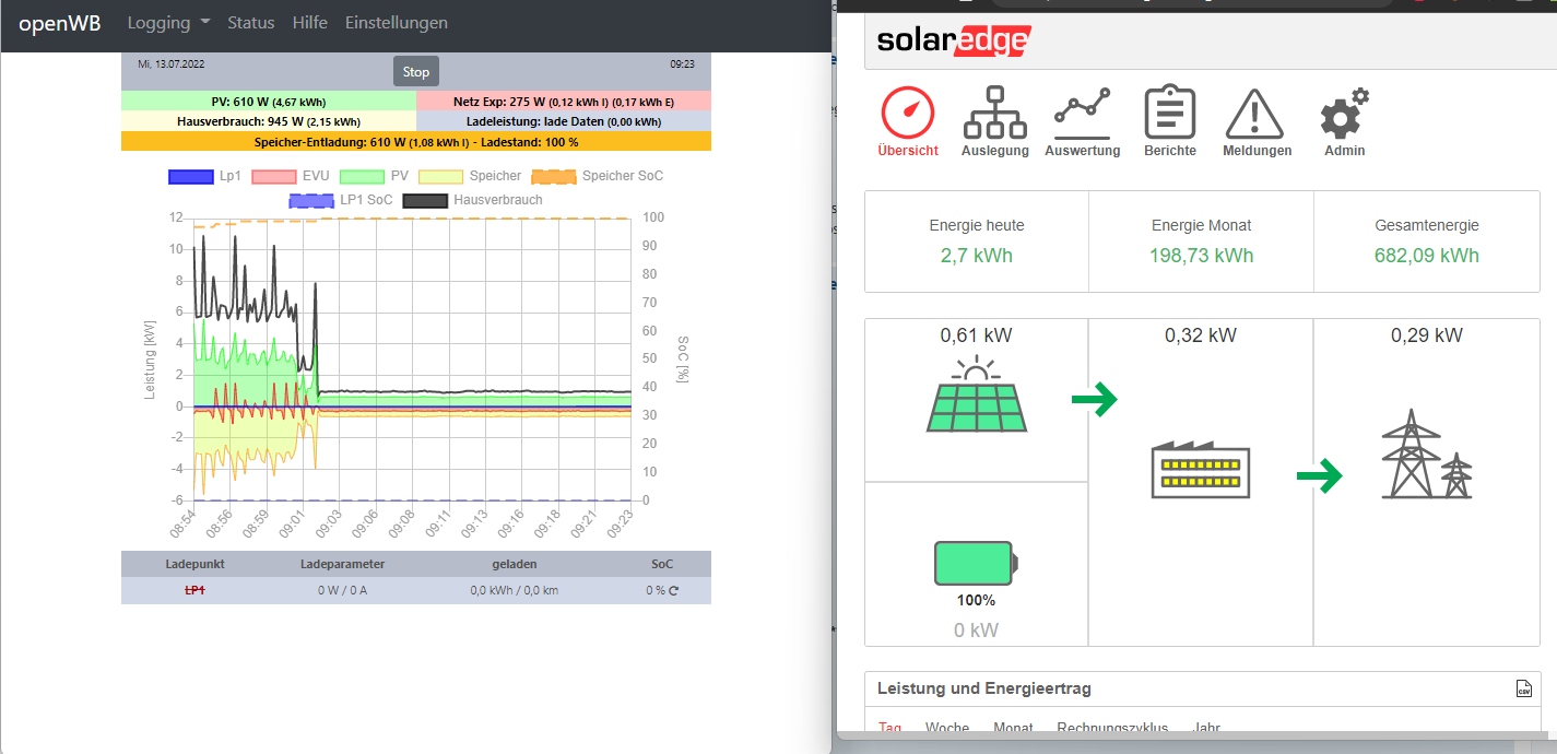 OpenWB zeigt in dem Beispiel 945W an, das SolarEdge Monitoring jedoch 320. Und ich bin relativ sicher, dass SolarEdge hier richtige Wert ist. Zudem fällt auf, dass der in OpenWB angezeigte Hausverbrauch ca. (Hausverbrauch + PV Produktion) in SolarEdge ist, sprich in dem Beispiel 320W + 610W = 930W.