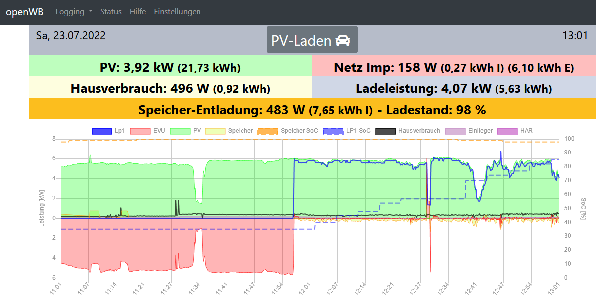 Trotz ausreichender PV Leistung wird der Ladestrom aber für das EV zu hoch berechnet, so dass zusätzlicher Strom aus dem Netz bzw. Speicher gezogen wird. siehe Screenshot.