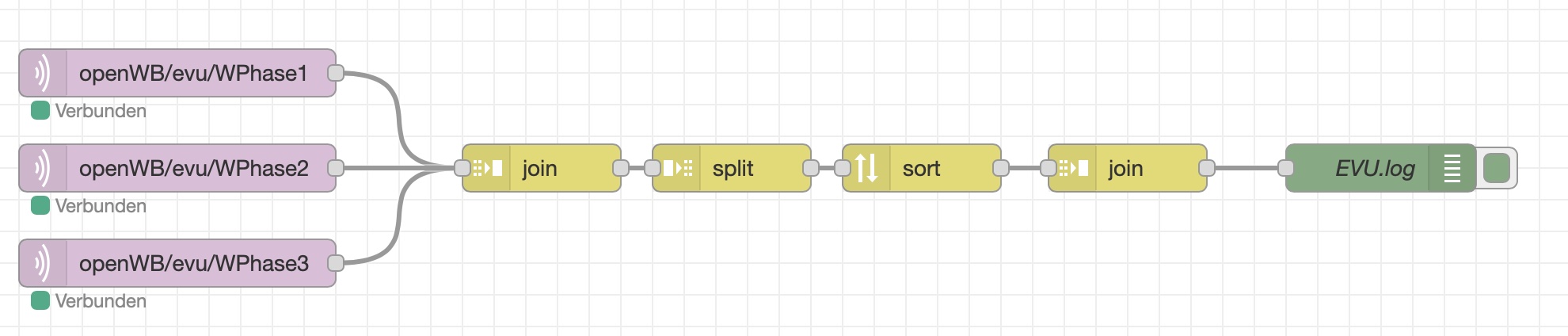 Da in der openWB die drei Phasen in einzelnen Topics sind, müssen die erst einmal zusammengefügt werden. Die erste join-Node wartet auf Werte von allen drei Phasen und packt diese in eine einzelne Message. Dummerweise ist die Reihenfolge der drei Werte vom Zeitpunkt des Publishen abhängig. d.h. es ist nicht immer L1, L2, L3. Deshalb wird die Message wieder auseinandergehackt, nach Topics sortiert und dann wieder zusammengeführt. Nun ist die Reihenfolge immer L1 L2 L3. Im Debug-Output sieht man dann die drei Leistungswerte. Dass die bei mir so aussehen ist normal, denn ich mache keine Nulleinspeisung. Aber bei @DFI sollten sie nie negativ werden.