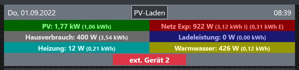 Zum einen nutze ich einen Webhook beim Abstecken um damit gleich das Tor zum Grundstück zu öffnen, wichtiger bzw. auch einfach schöner finde ich es, Heizung (Wärmepumpe) und Warmwassererzeugung (läuft autonom über eine gesonderte kleine Wärmepumpe) gleich im Header darzustellen. Ausgelesen werden die über SDM120 bzw. SDM630 und das LAN Interface.HSC hat geschrieben: Mi Aug 31, 2022 12:09 pm Vlt. können ja die SH- alt- Nutzer auch mal mitteilen, warum sie speziell das alte Modul verwenden wollen oder müssen.