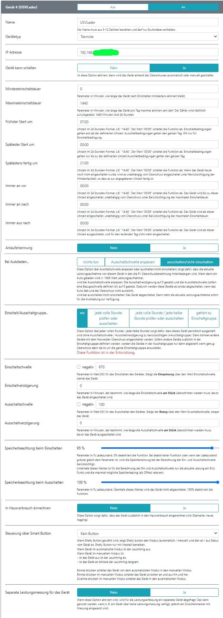 Nun hätte ich erwartet, dass das Gerät bei einer Einspeisung von über 1000W eingeschaltet wird. Allerdings wird das Gerät schon vorher aktiviert, sobald die PV Strom erzeugt (die Schwelle kann ich leider nicht nennen) und das obwohl der Speicher (Tesla Powerwall) irgendwo bei 40% rumdümpelt. Sobald ich ein Auto zum Laden anstecke, wird das Gerät auch ausgeschaltet (wie konfiguriert).
