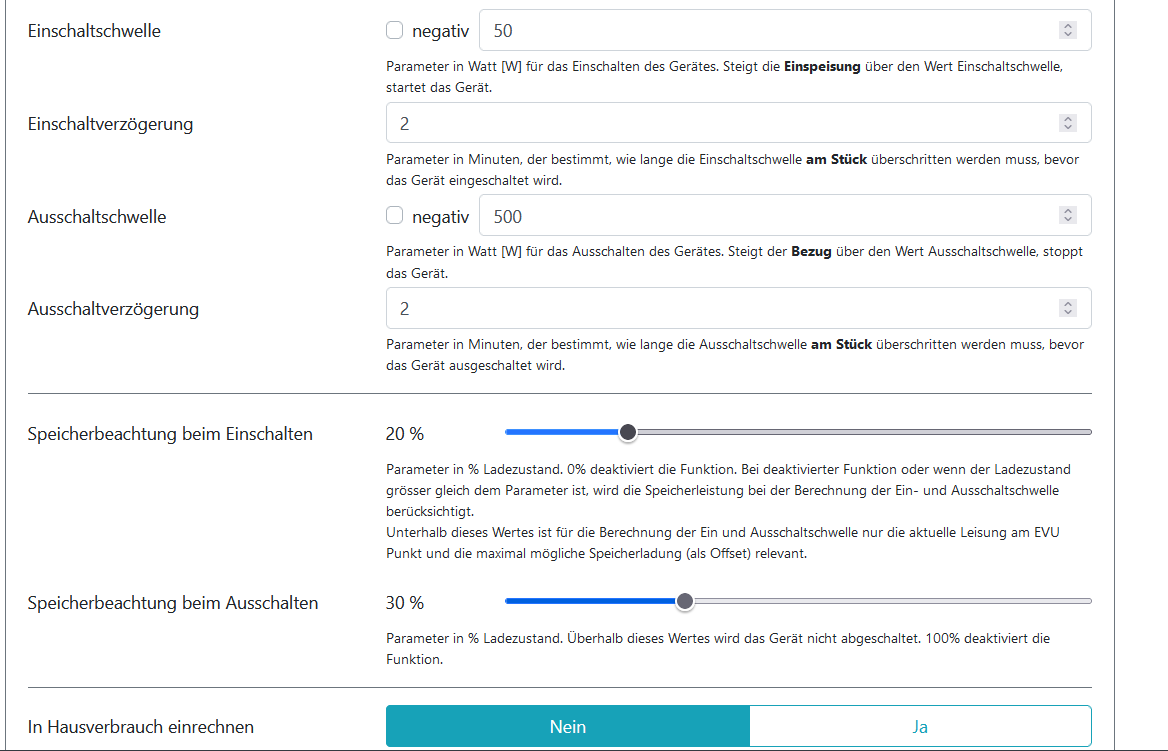 An den Einstellungen in Smart Home 2 habe ich zunächst nichts verändert. Gesteuert wird über Modbus. Trotzdem kam es zu ständigem Ein- und Ausschalten des Heizstabes im Sekundentakt, selbst als der Speicher voll war.