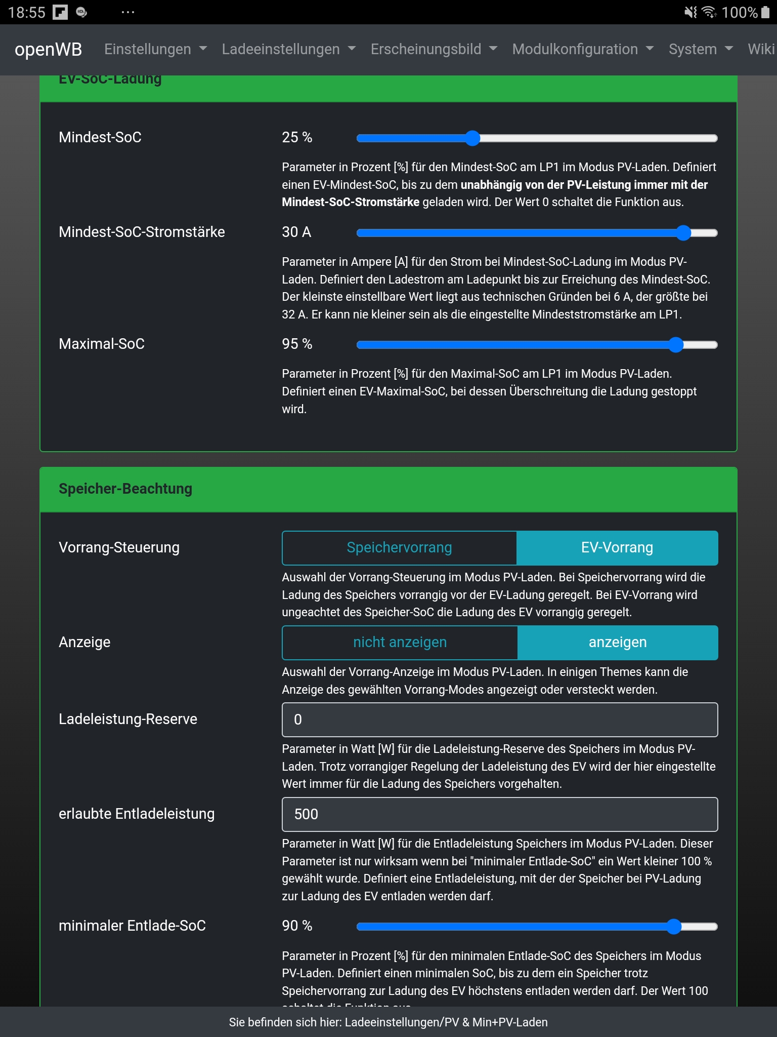 - Einstellungen/Ladeeinstellung/Min+PV Laden/ Speicherbeachtung