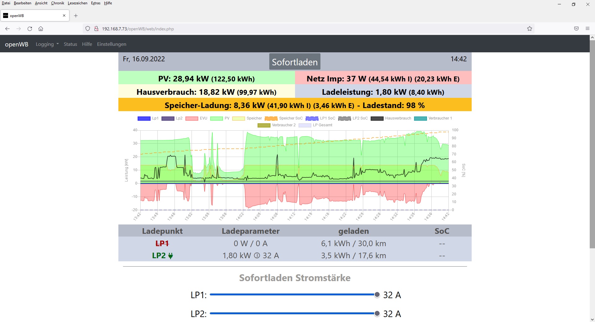 2022-09-16 14:54:18: PID: 16854: Sofort ladung Ladepunkt 2 erreicht bei 32 A (LV1) at 378 sofortlademodus sofortlademodus.sh