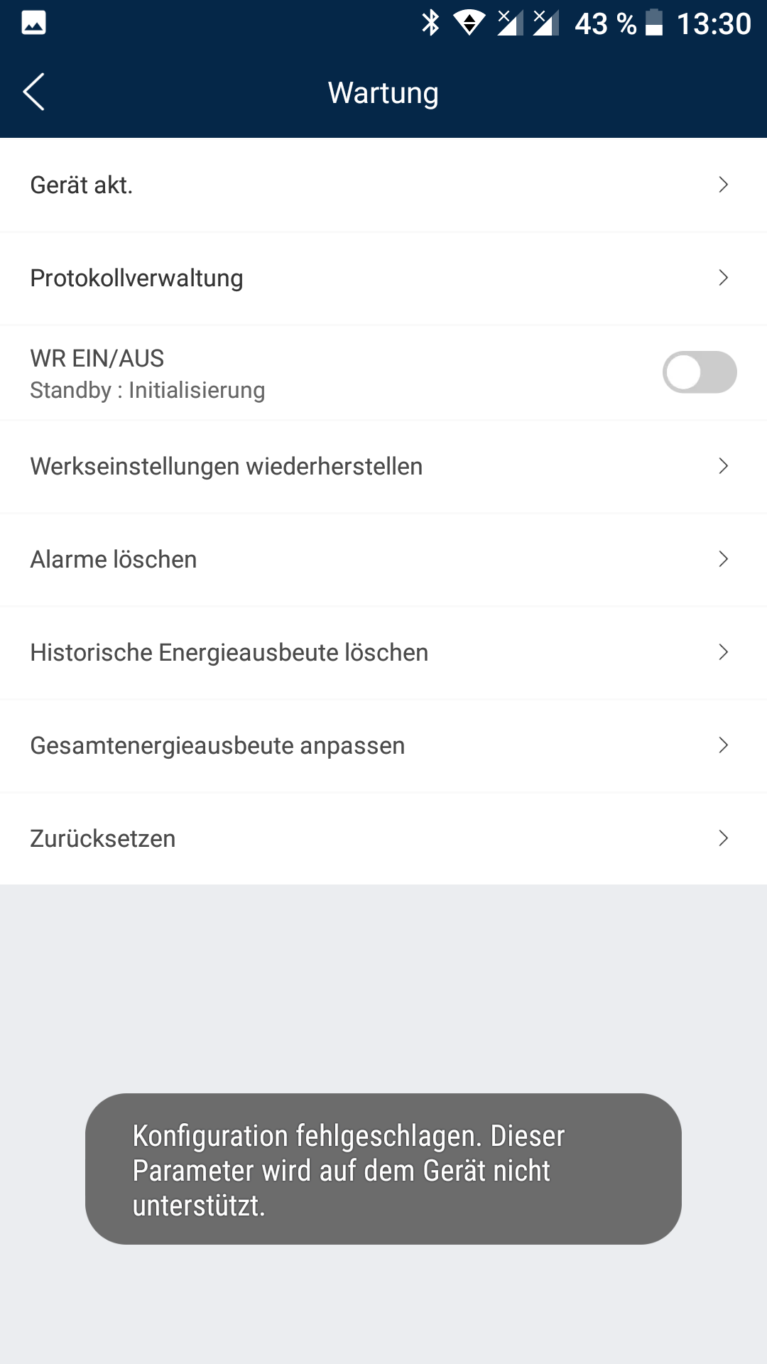 Guten Tag , also wir haben nun den Power Meter verbaut und nach Anleitung verkabelt . Extra provisorisch ein 50 Meter langes Kabel verlegt . Leider findet der Wechselrichter jedoch den Power Meter nicht . Alle Versuche da eine Verbindung zu bekommen sind gescheitert . Nach mehreren Versuchen ist nun die Kommunikation mit dem Wechselrichter komplett gescheitert . Ich komme zwar per Wlan in den Wechselrichter , der kommuniziert jedoch nicht mehr per Internett . Einstellungen sind nicht mehr möglich , Auch ein zurück setzten auf Werkseinstellung wird verweigert . Das online und auch auf dem Handy . Das Online Konto löschen und auch die APP neu installieren hat nichts gebracht . Der Wechselrichter ist noch online und liefert Strom obwohl die APP auf dem Handy sagt das er offline ist . Der Befehlt online zu gehen wird nicht ausgeführt bzw verweigert .