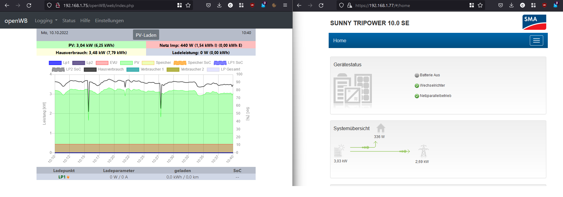 ich habe das Problem, dass wie Wallbox in Verbindung mit einem SMA Modbus TCPWr falsche Werte über den Hausverbrauch anzeigt. Ich habe nachfolgend einmal ein Screenshot von der Darstellung der openWB und vom Wechselrichter parallel. Hier sieht man, dass der Erzeugungswert der PV richtig ist, aber der Hausverbrauch überhaupt nicht stimmt. Im Bild speist die PV 2,69kW ein, die Wallbox denkt jedoch, dass ich 3,49kW verbrauche was in Wahrheit nur 0,336kW sind.