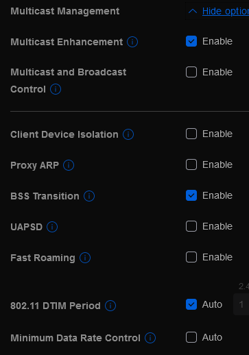 Zum Wlan: Ich habe dort Multicast DNS und/oder IGMP Snooping testweise (de)aktiviert. Im Anhang einmal ein Screenshot der Wifi-Config. Dort habe ich auch Multicast Enhancement testweise deaktiviert.