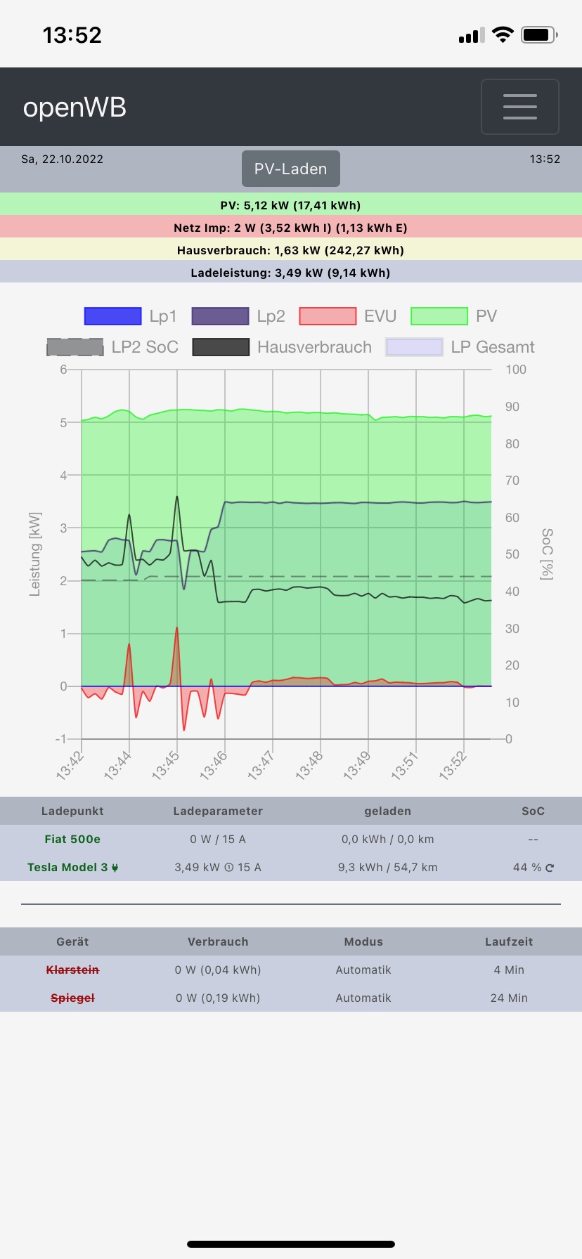 Anbei einmal zwei aktuelle Bildschirmaufnahmen. Einmal direkt übers WLAN und einmal per Cloud. Man sieht einige Daten sind aktuell und andere völlig wirr. Zum Beispiel lädt ja gerade nur der Tesla, aber der Fiat steht als angeschlossen da. Die SmartHome sind total falsch und der Elwa Heizstab wird gar nicht mehr über die openWB angesteuert, sondern direkt über den SMA Sonny Home Manager 2.