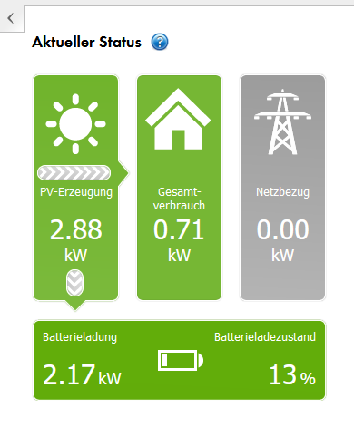 Die PV-Anlage selbst funktioniert ja einwandfrei. Da die Sonne scheint ist bisher meine Batterie zu 70% gefüllt. Ja, es ist richtig, dass offensichtlich die Speicherung in der Batterie in der openWB als Hausverbrauch gewertet wird. Die SMA-Geräte unterscheiden das aber.