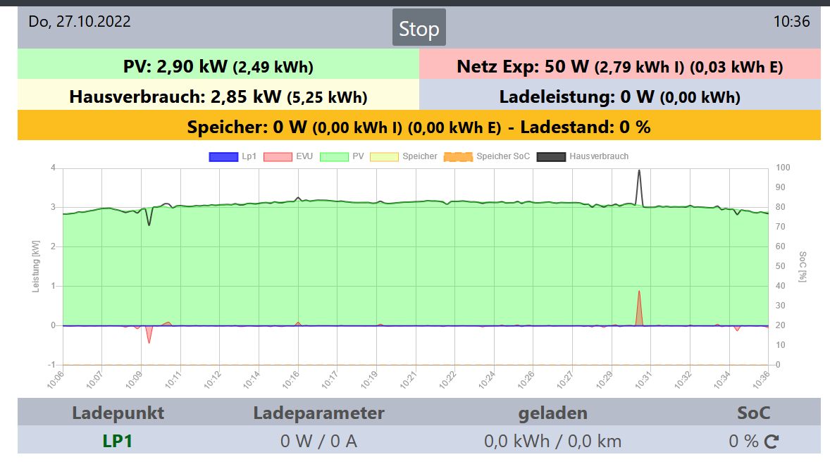 Auffällig ist, dass die Batterie geladen, dieses aber nicht in der openWB angezeigt wird. Die Batterieladung ist in der openWB in den Hausverbrauch eingerechnet.