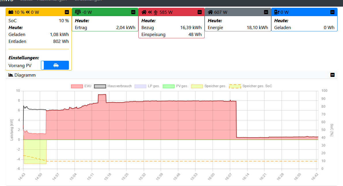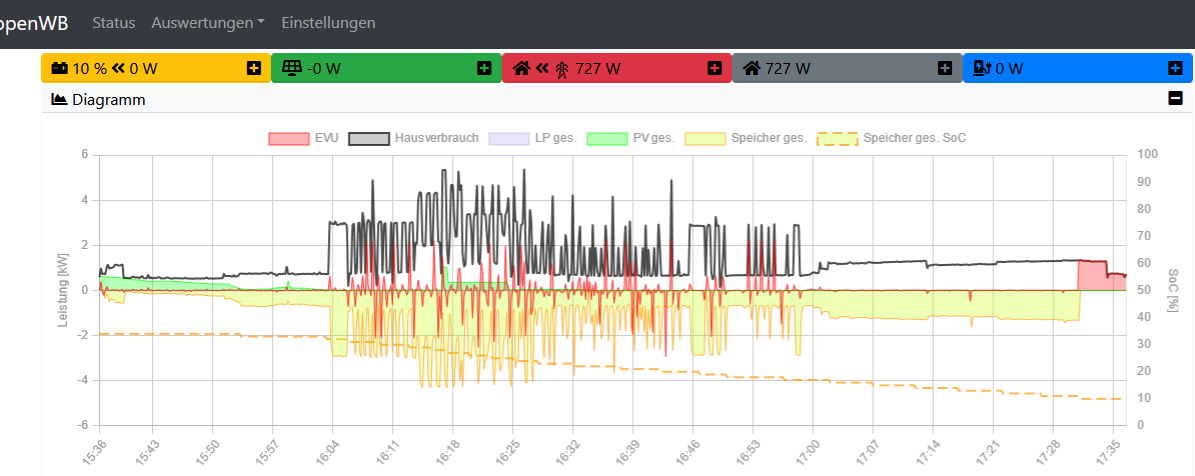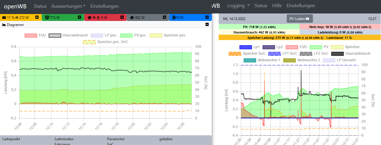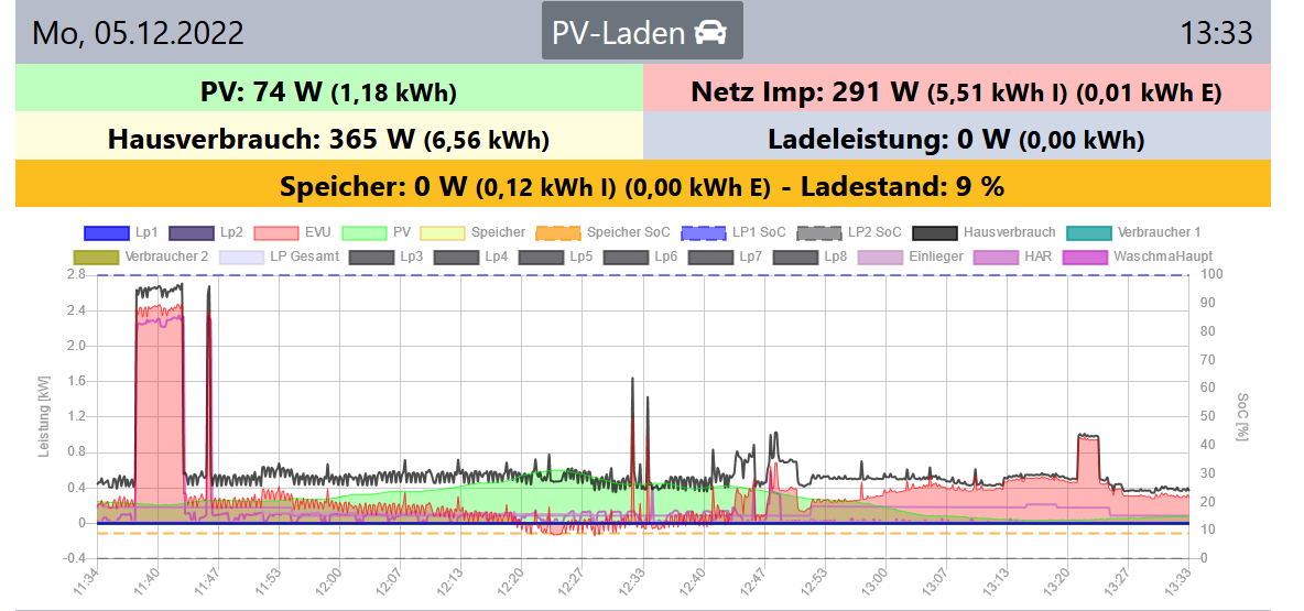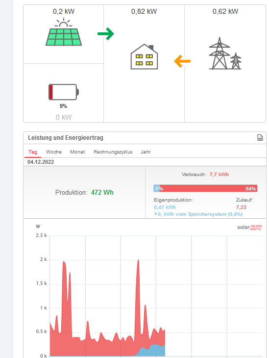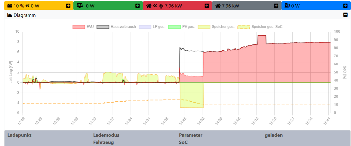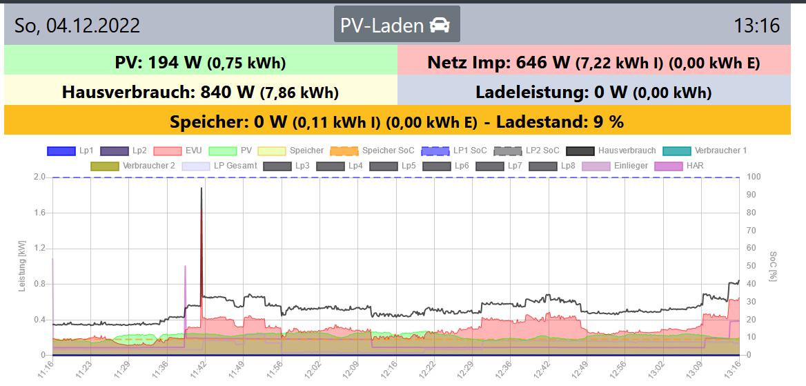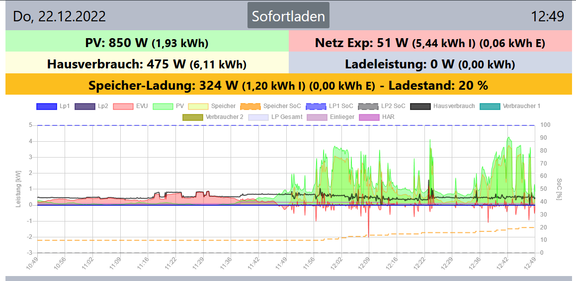 Die Leistungswerte werden ( mit PV Erzeugung ) jetzt wieder richtig angezeigt. ( 2022-12-13 17:22:15 +0100 [262b5f09] ) Hausverbrauch und übrige Werte sehen auch ohne PV- und Speicher-Leistung gut aus