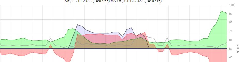 Allerdings regelt er sehr schnell hoch, auch wenn die Leistung nicht vorhanden ist und geht dann wieder runter, aber relativ schnell wieder hoch, so dass 50-60% aus dem Netz kommen. (um 13:15 Uhr habe ich den LP deaktivert)