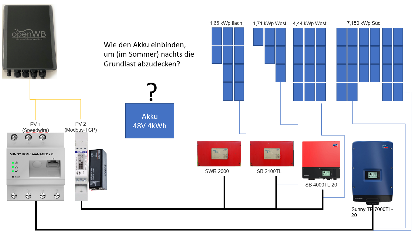 Wie kann ich die 48V-Batterie so in das bestehende Szenario einbinden? Ich brächte eine Art Wechselrichter, welcher den gemessenen Hausverbrauch vom Sunny Home Manager ausliest und dann entsprechend des Bedarfs den Netzbezug aus dem Akku gegen 0 ausgleicht... Und sich am Besten bei PV-Überschuss auch um die Ladung des Akkus kümmert...