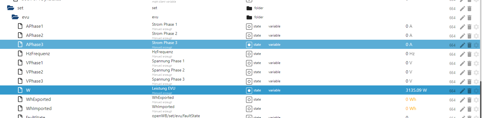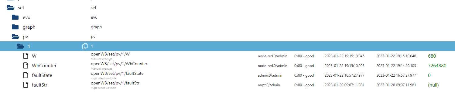 Bei dem ersten Satz nehme an meinst Du wie die Werte korrekt zu summieren sind. Werde darauf achten. Ich wäre allerdings bereits zufrieden wenn die openWB schon mal irgendwas von meinen Werten lesen könnte, aktuell ist nichts da, sogar wenn ich bloß von einer der 3 PVs die Werte auslesen und per MQTT am die openWB übergeben möchte. Zuletzt habe ich versucht, die Werte vom EVU in die PV Berechnung zu nehmen da es nun dunkel ist.