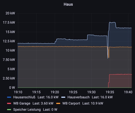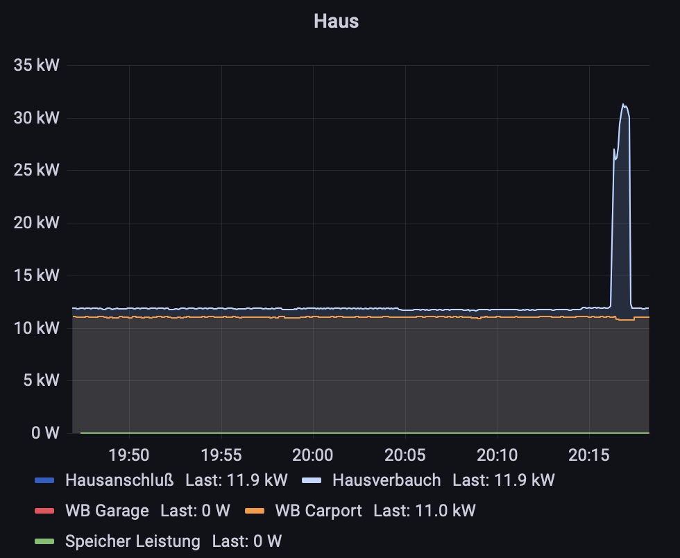Im zweiten Bild die zeitliche Abweichung zum Hausverbrauch liegt daran, dass die InfluxDB/ Grafana nicht synchron aufzeichnet (Hausverbrauch kommt direkt aus dem DP des E3DC).