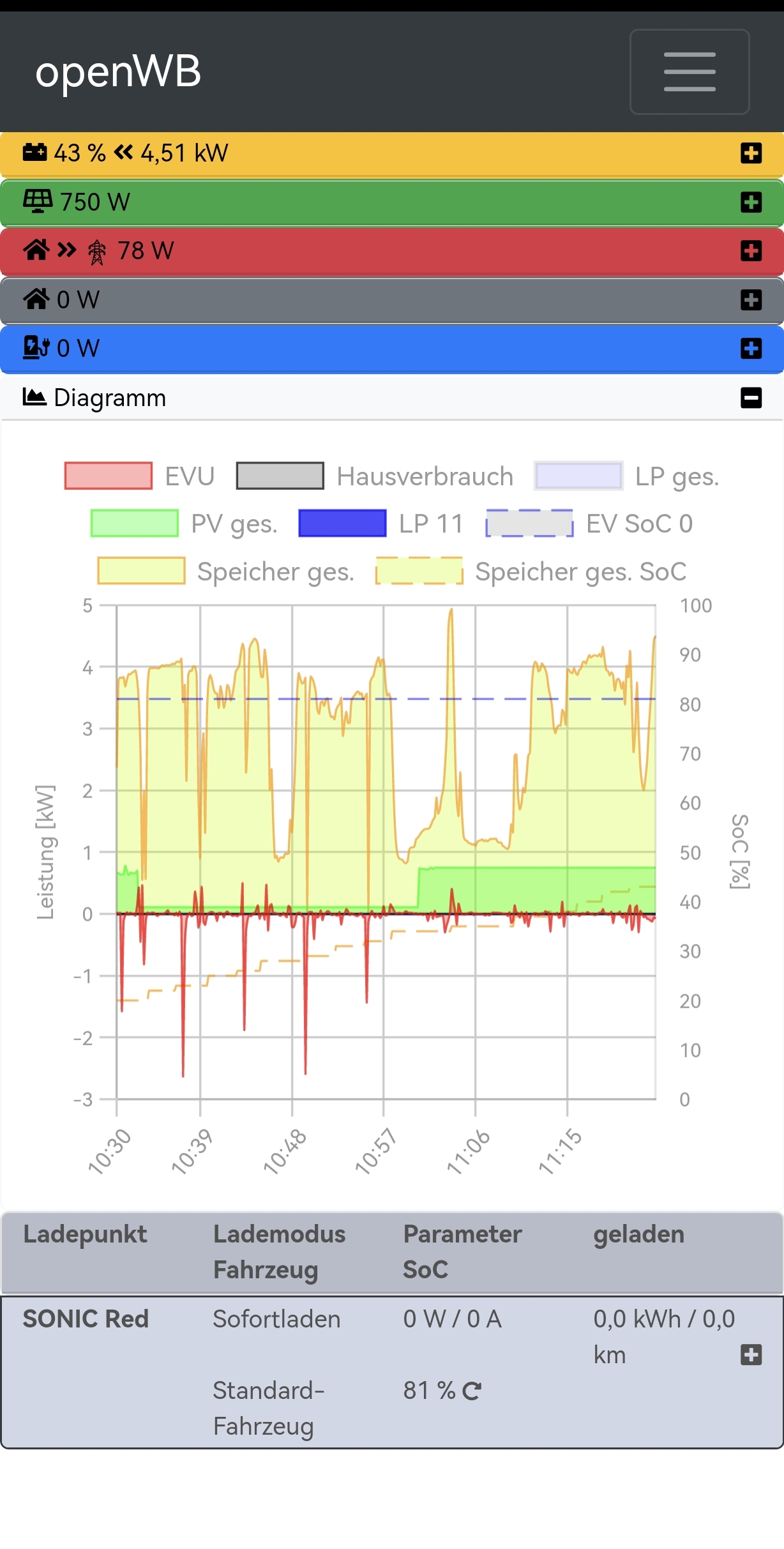 4KW PV Erzeugung, 3KW gehen in den Speicher und 1KW Hausverbrauch