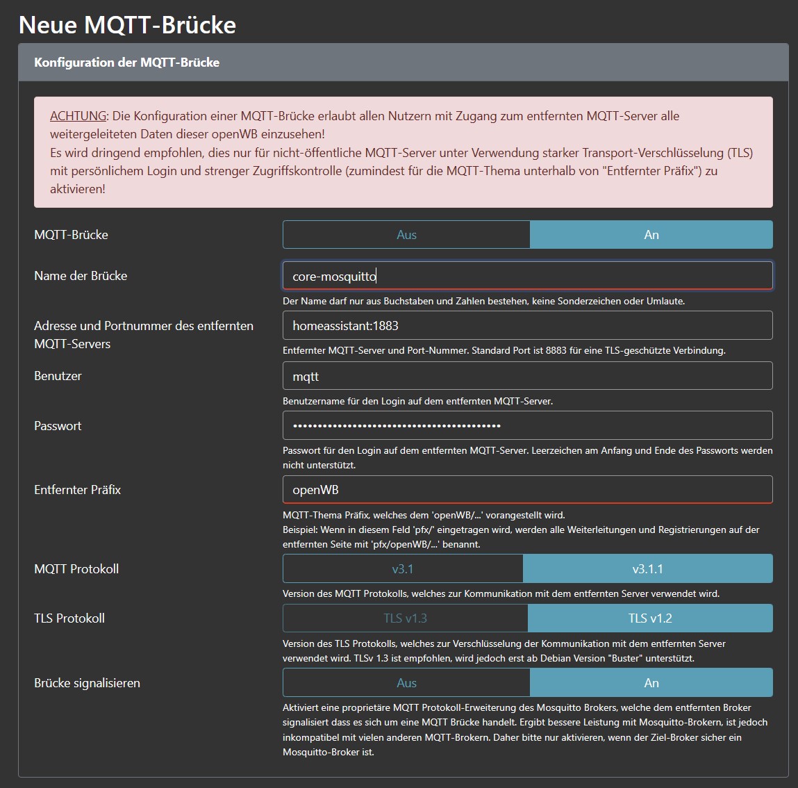 In HA habe ich die Integrationen mosquitto broker und OpenWB wie folgt Konfiguriert: In OpenWB will ich es wie folgt Konfigurieren: Das scheint aber irgendwie nicht zu stimmen, weil OpenWB hier die Konfig direkt rot markiert.