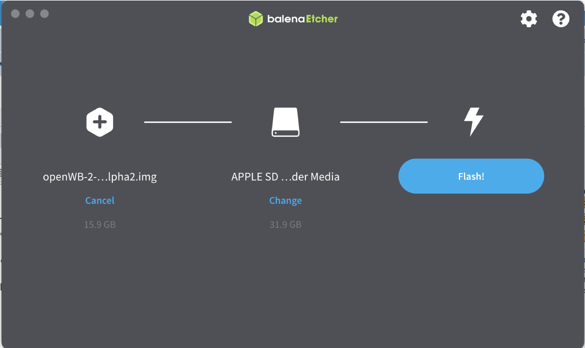 2) ich wolle dann mit einer anderen SD Karte das Image (openWB-2-bullseye-alpha2.img) für die 2.0 installieren. Mit balenaEtcher auf Mac hat das allerdings nicht funktioniert. Direkter Abruch beim Schreiben (siehe Screenshot).