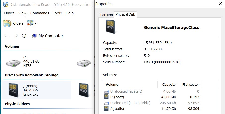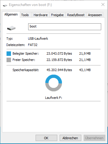 Kommt es Dir nicht seltsam vor, dass bei einer 16GB Karte nur 43,1MB erkannt werden? Das ist die Boot Partition. Die ist in Fat32 formatiert und wird von Windows erkannt. Die Root Partition hingegen erkennt Windows nicht und ist daher auch nicht in Deinem Image drin.HorstBlass hat geschrieben: Do Apr 06, 2023 3:40 pm Ich hatte bei der letzten Sicherung diesen Screenshot der SD Karte unter Windows gemacht.