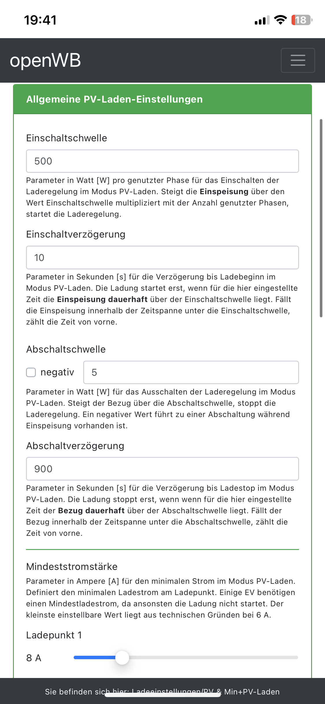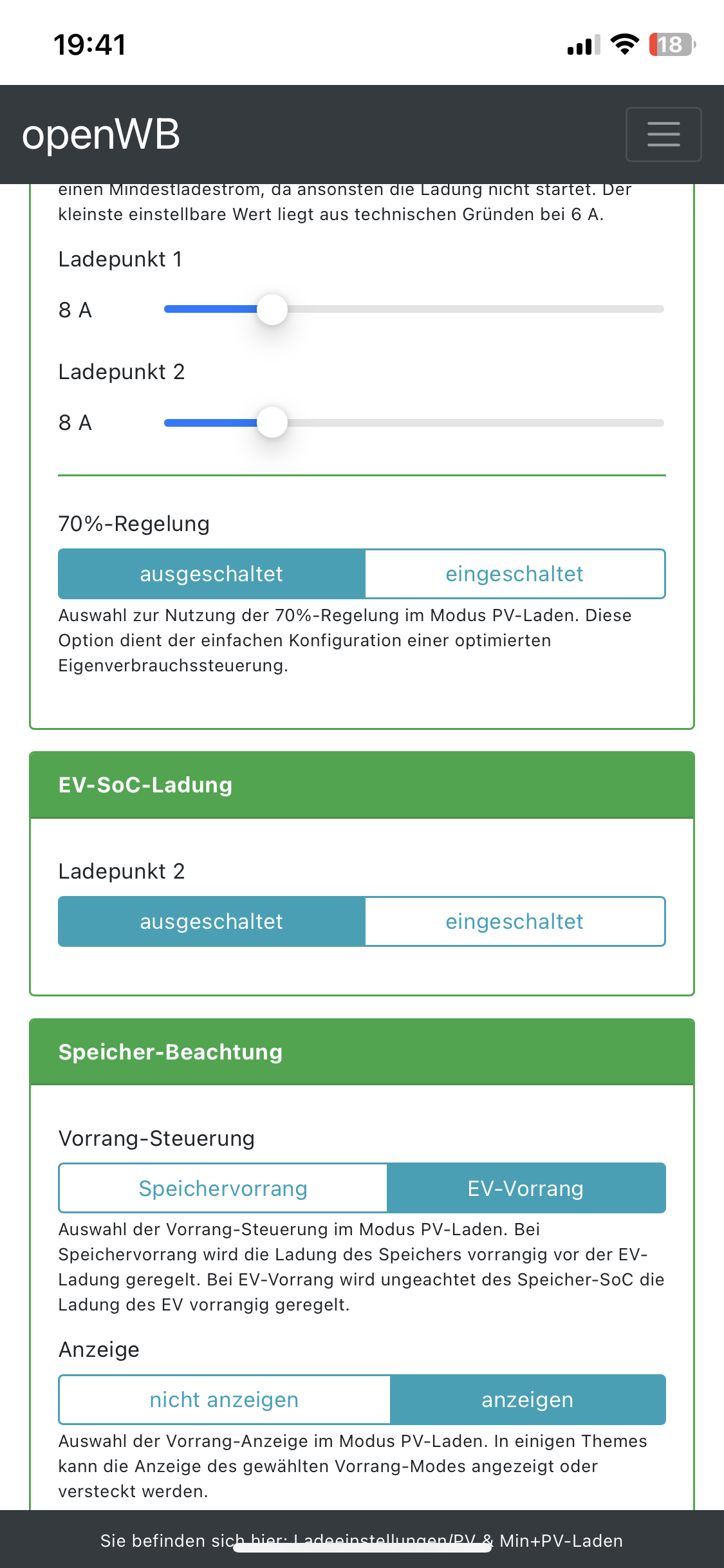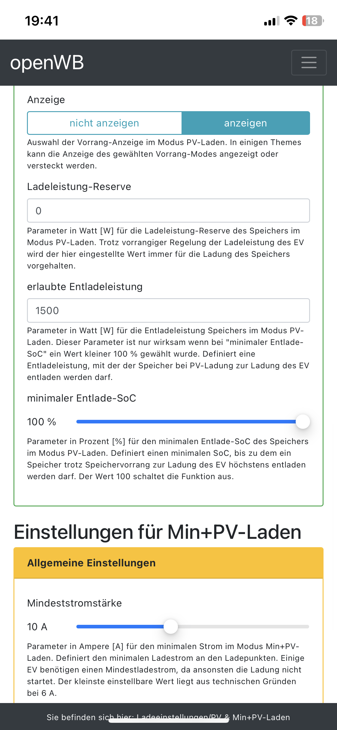 seit 1 Woche habe ich ein Fronius WR mit BYD Speicher am Laufen und habe heute das erste mal meinen Smart geladen (am LP2). Dabei ist mir folgendes Aufgefallen. Im Lademodus "PV" wurde trotzdem der Speicher mit entladen. Ich weis jetzt nicht genau warum das Zustande kommt. Vermutlich liegt es an den Einstellungen. Kann es sein dass es an der Mindeststromstärke von 8A zusammenhängt, welche der Smart benötigt? Könnte mir da jemand helfen? Ich hätte eigentlich erwarten, dass die Ladeleistung gleich der PV Leistung ist.