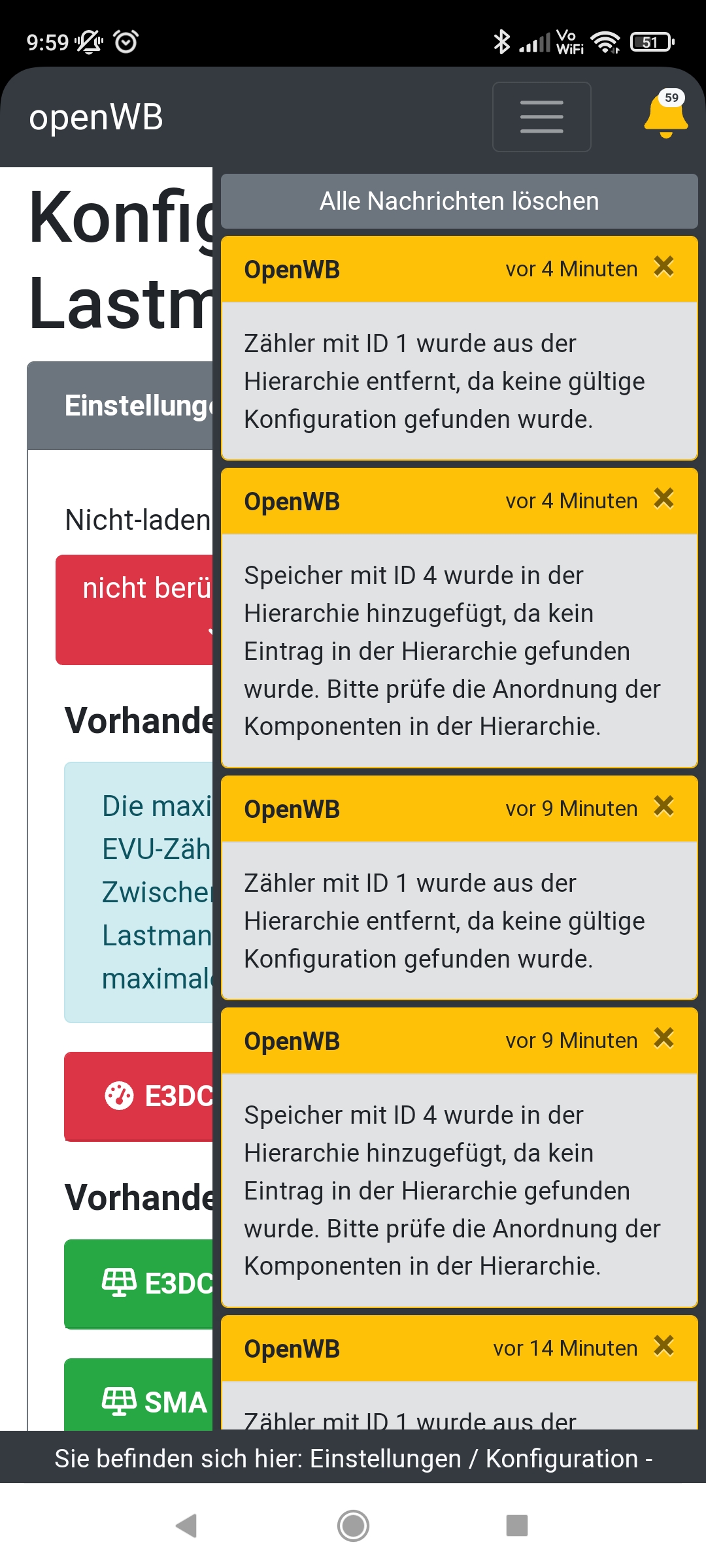 Seit heute 02.06.2024 ca. 7:30 Uhr stimmt die Leistungsanzeige in der OpenWB nicht mehr und es sind diverse Warnmeldungen erschienen, dass Zählermodule mangels gültiger Konfiguration aus der Hierarchie entfernt wurden. Dann fugt OpenWB sie automatisch wieder hinzu, weil sie fehlen... Siehe Screenshot.