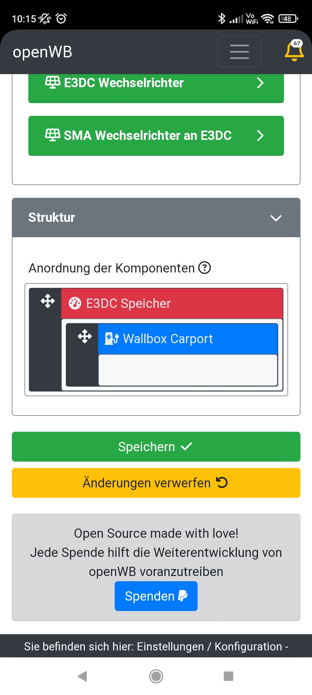 Habe sowohl E3DC als auch OpenWB neu gestartet. Beide haben die neueste Software. OpenWB ist auf Softwarestand 2024-03-19 06:56:08 +0100 [a6b648645].