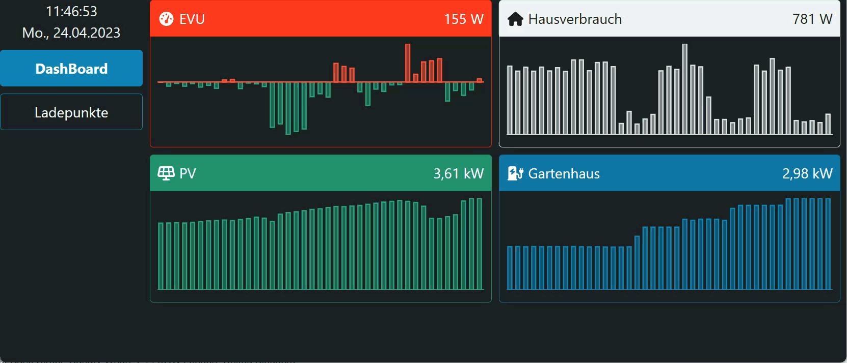 * Die Diagramme stellen einen unterschiedlichen Zeitraum dar, das Diagramm für den Ladepunkt Gartenhaus rauscht sehr viel schneller durch als der Rest. Das ist eher blöd da die Werte der Unterschiedlichen Diagramme dann nicht zusammen passen.