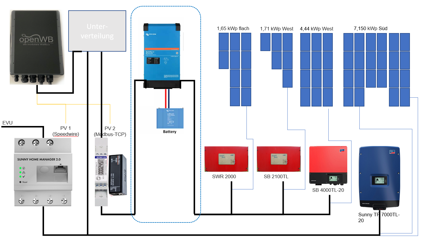 Im Moment überwiegen tatsächlich leider die Hürden. Der MP2 und die Akkus müssten im Carport Platz nehmen (und an die Unterverteilung), da im Hauswirtschaftsraum, in dem die Hauptverteilung hängt, kein Platz mehr ist. Da der EM540 noch in die Hauptverteilung möchte, allerdings auch hier der Platz mehr als erschöpft ist, wird es langsam wirklich schwierig. Wobei... evtl. könnte dann ja der SHM2.0 raus fliegen und der EM540 auch für die OpenWB als EVU-Zähler fungieren. Dann bräuchte es halt "nur" noch eine Busleitung zwischen Carport (Multiplus) und Hauptverteilung (EM540).