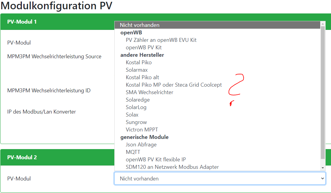 Die PV2 ist aktuell noch nicht belegt. Hier kann ich aber dann weder den MPM3PM Zähler auswählen noch den GoodWe WR. Die Auswahlliste ist deutlich kürzer als bei der PV1: Gibt es denn hier im Forum niemanden, der mit OpenWB und einer PV gestartet ist und diese nun um eine zweite PV mit Batterie erweitert?
