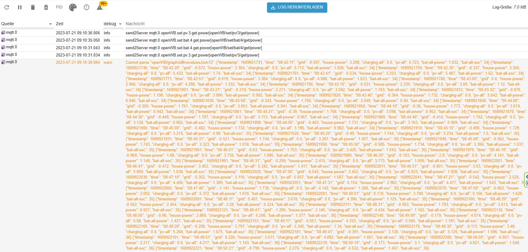 Mir fällt aber auf das mir der Iobrokerlog mit sehr vielen MQTT Warnmeldungen zugepustet wird. Das Logfile wird dadurch sehr lange.