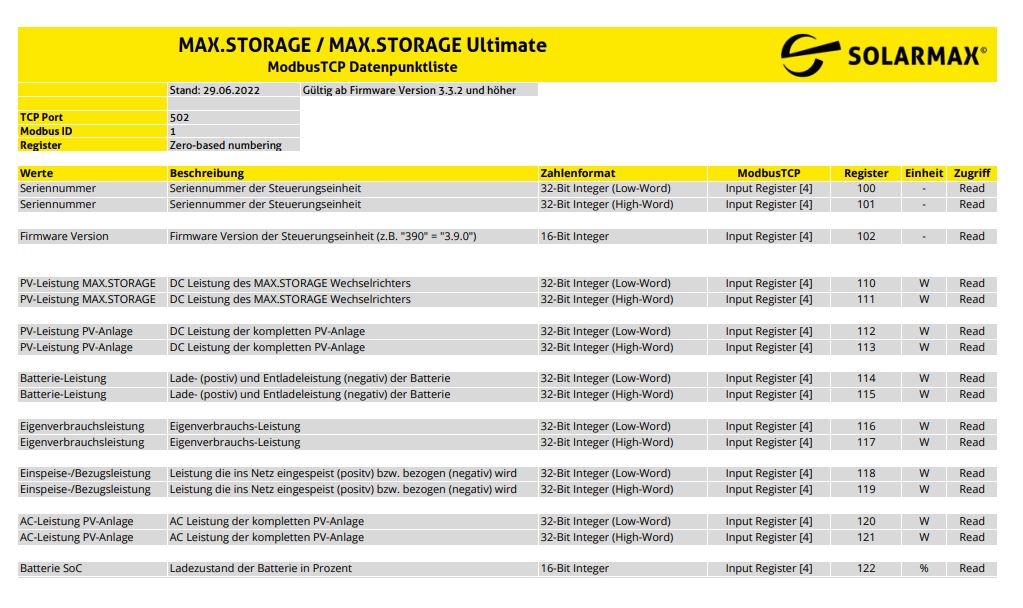 Hier die Modbus Register des SolarMax Ultimate Speichers.