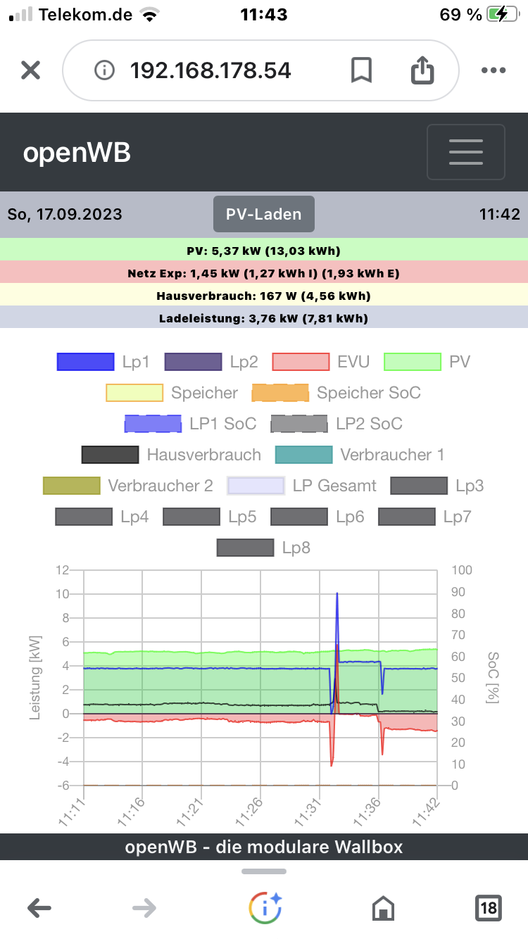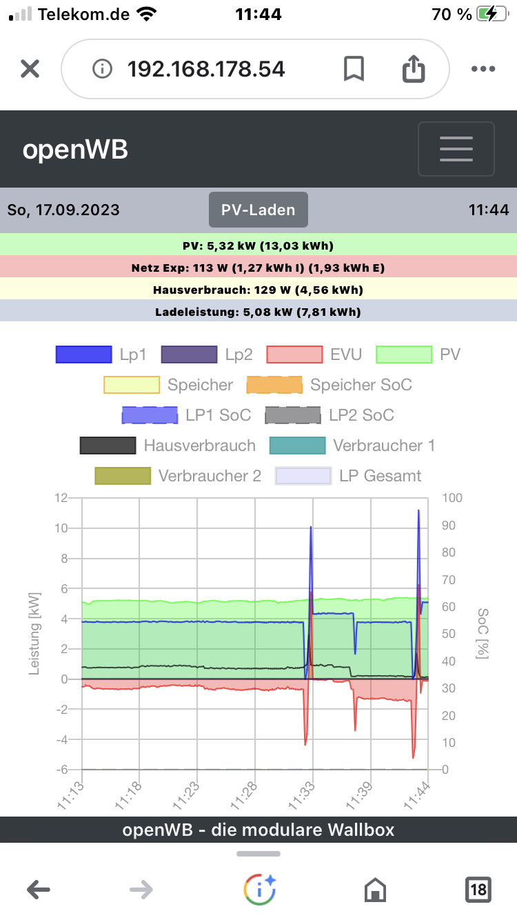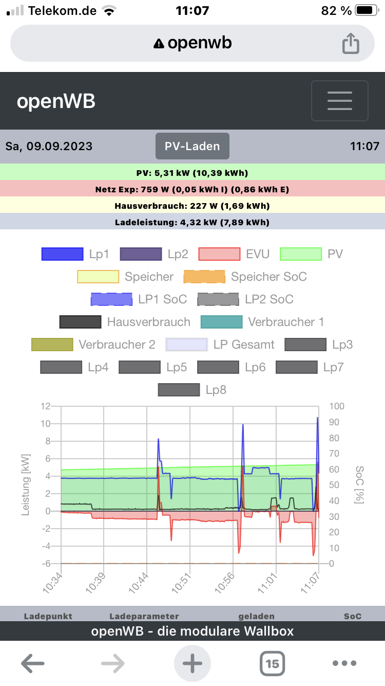 10kWp PV mit SMA Tripower 10000TL-10 (PE11 mit SDM72V2); 2,4kWp mit Solis 2.5 G6 (EE11 mit SDM120). OpenWB Standard+. EVU EM540 an einem Raspi mit Venus OS. BEV Mercedes EQA 250+ (07/2025)