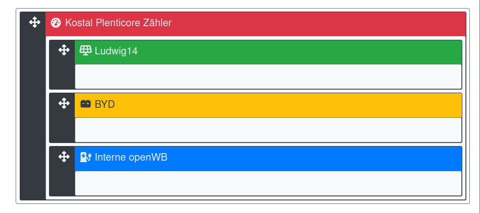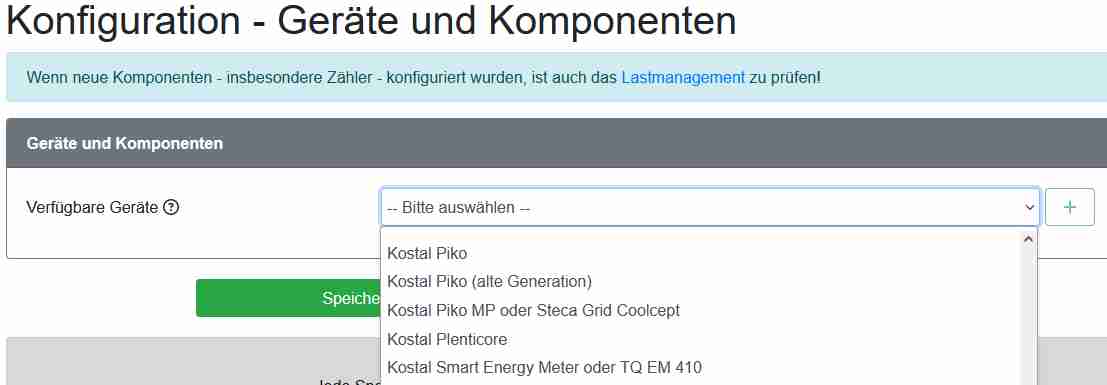 In OpenWB Unter Einstellungen->Konfiguration->Geräte und Komponenten den Plenticore hinzufügen und darunter die Komponenten Plenticore, ggf. Speicher und Plenticore Zähler (Beachten, ob das KSEM den Hausverbrauch misst, wenn ja, Link zum Wiki folgen.