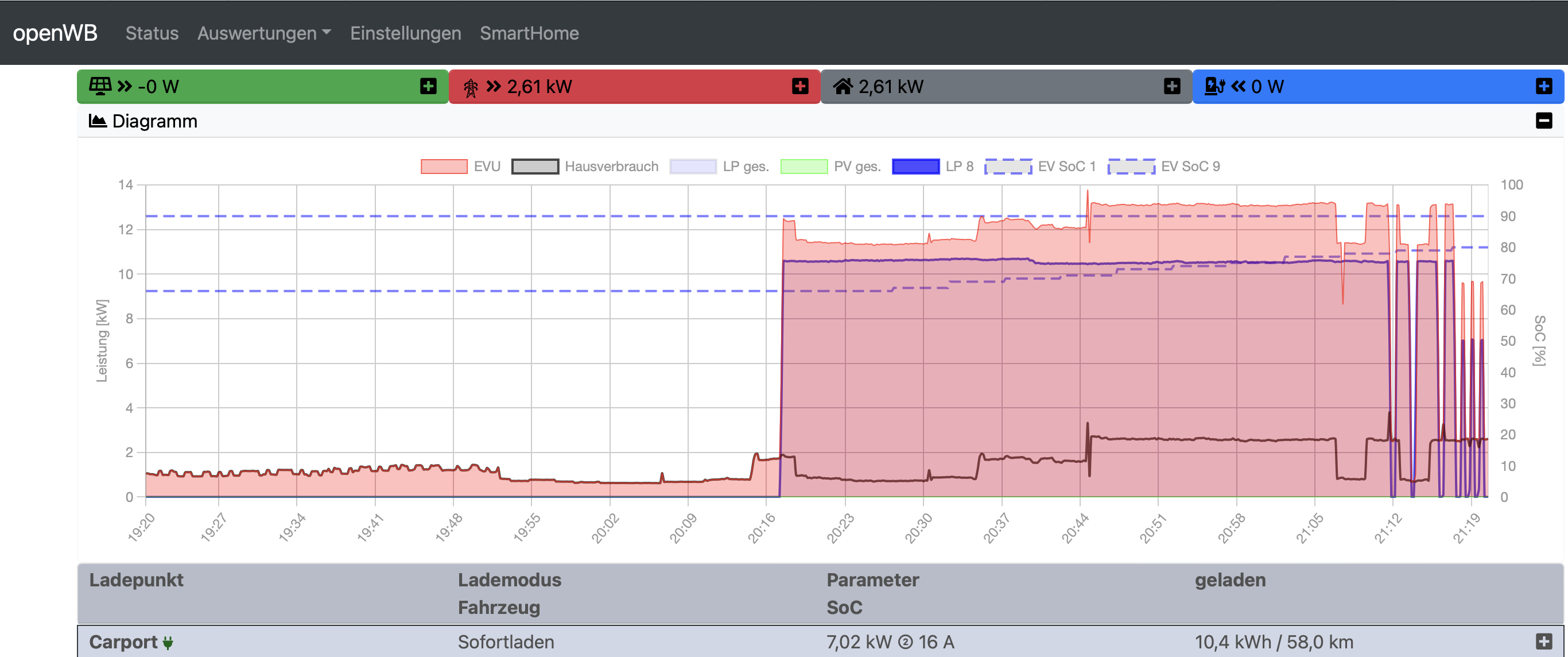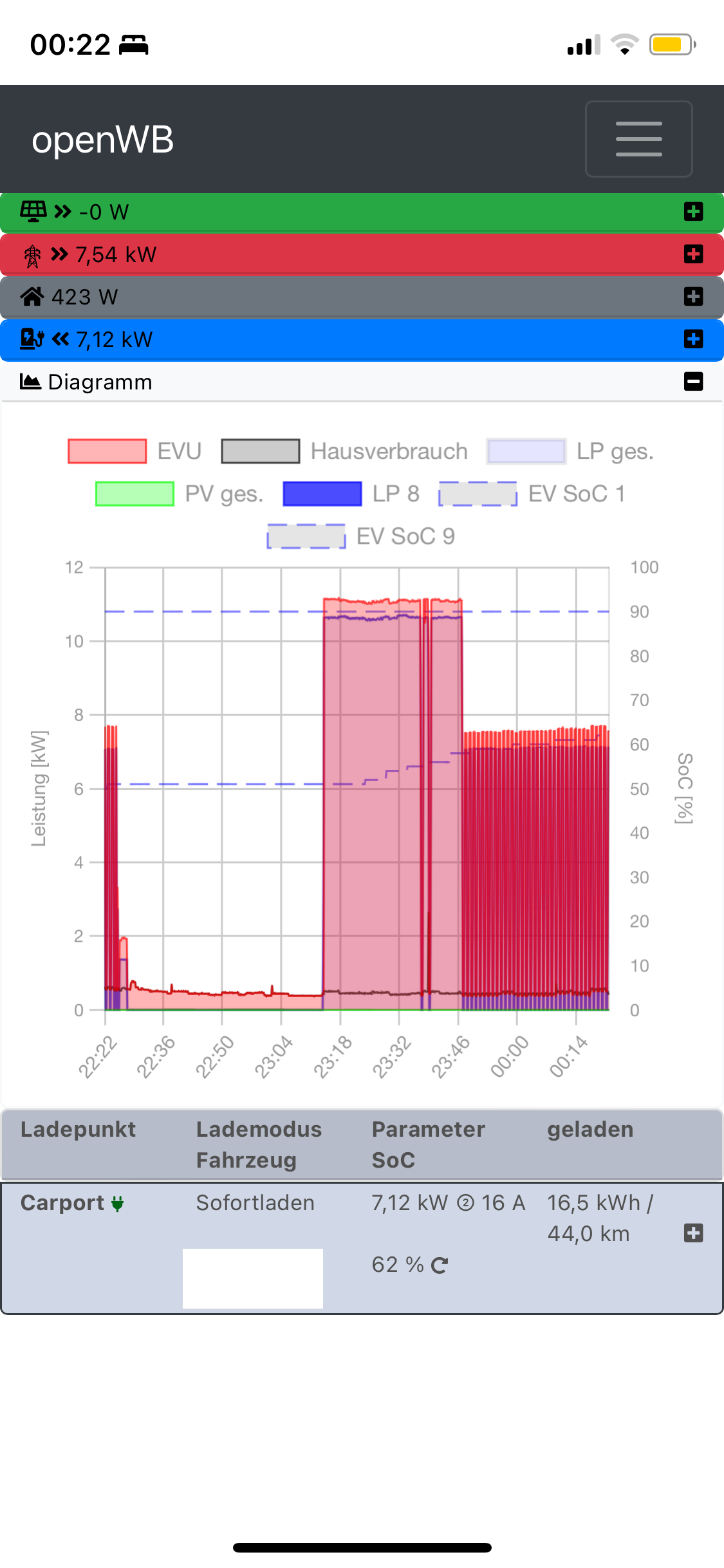 Nach 30-60 Minuten wird die Ladung allerdings beendet und im Minutentakt hin- und hergeschaltet zwischen keiner Ladung und 2-phasiger Ladung mit 7kW (siehe Screenshot).