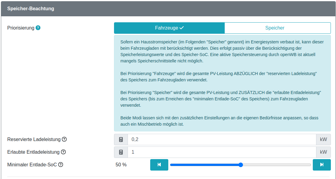 "Priorisierung Fahrzeuge" klingt für mich zunächst, als würde das Fahrzeug mit Priorität geladen werden, wobei Strom aus dem Hausspeicher entnommen werden kann. Dafür gibt es ja zusätzliche Fein-Einstellungen darunter (Reservierte Ladeleistung / Erlaubte Entladeleistung / Minimaler Entlade-SoC).