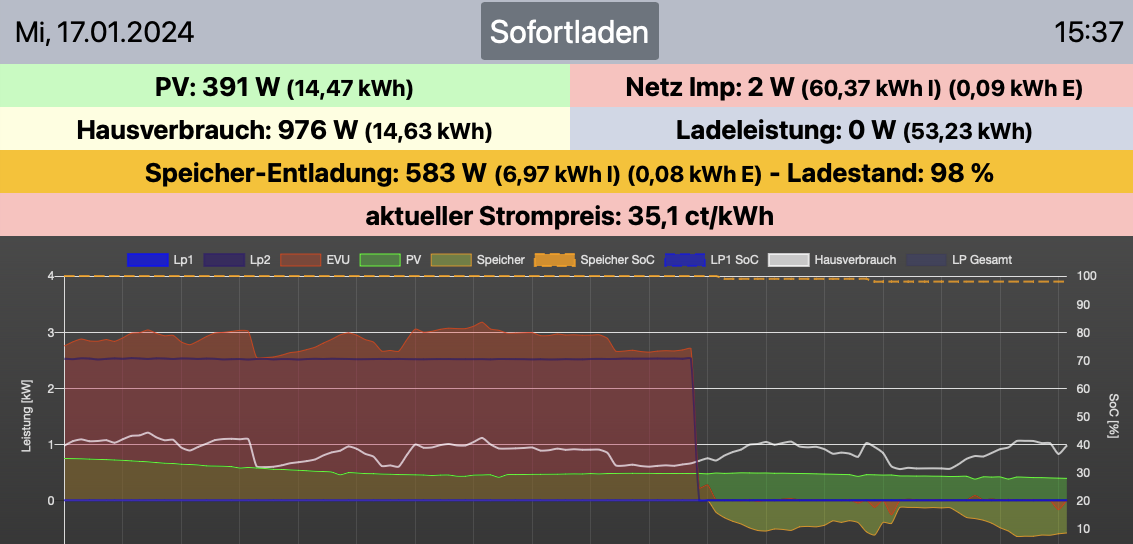openWB 1.9.304.0 (2023-10-17 09:35:37 +0200 [8b6173fb] ) steht auf PV-Laden. Obwohl die Sonne längst weg ist, lädt die Box das EV fleißig weiter. Der Speicher wurde zu diesem Zeitpunkt nicht entladen (stand auf 100%), der wird durch fhem gesperrt, solange ein EV lädt. Erst nachdem ich auf Sofortladen umgestellt habe (Strompreis lag über der Grenze), hörte die Ladung sofort auf.
