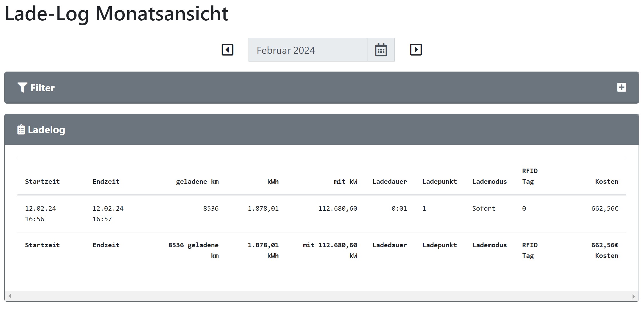 Startzeit Endzeit geladene km kWh mit kW Ladedauer Ladepunkt Lademodus RFID Tag Kosten